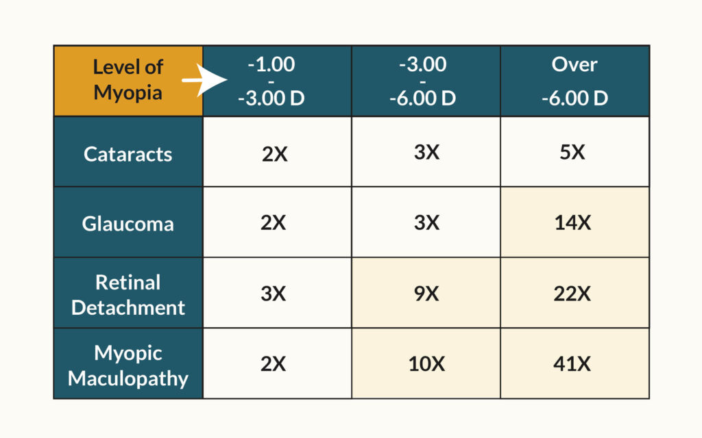While any level of myopia carries the risk of complications, high myopia (prescriptions higher than -6.00 diopters) significantly increases the likelihood of developing a serious condition. That’s where myopia management makes a difference.
